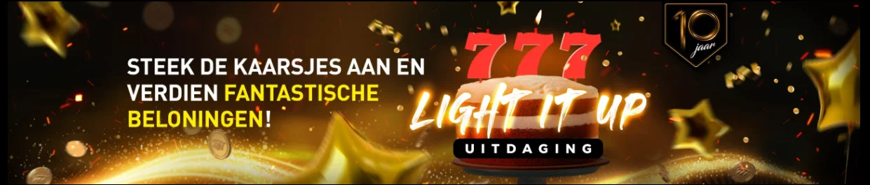 De 10e verjaardag van Casino 777 werd de volledige maand september uitbundig gevierd. Om deze verjaardagsmaand in schoonheid af te ronden, mag jij kaarsen aansteken om extra in de prijzen te vallen. Er worden extra Geldkluis tokens en Premium Coins uitgedeeld voor elke kaars die je aansteekt. Pak deze Light It Up Promo bij de horens en laat het branden.